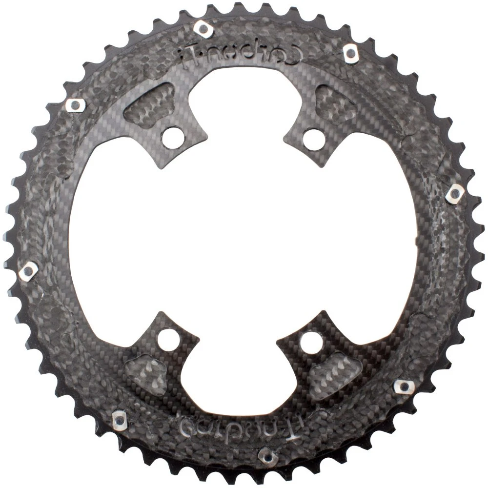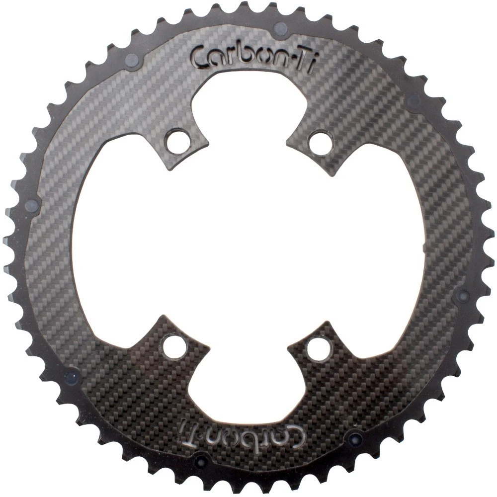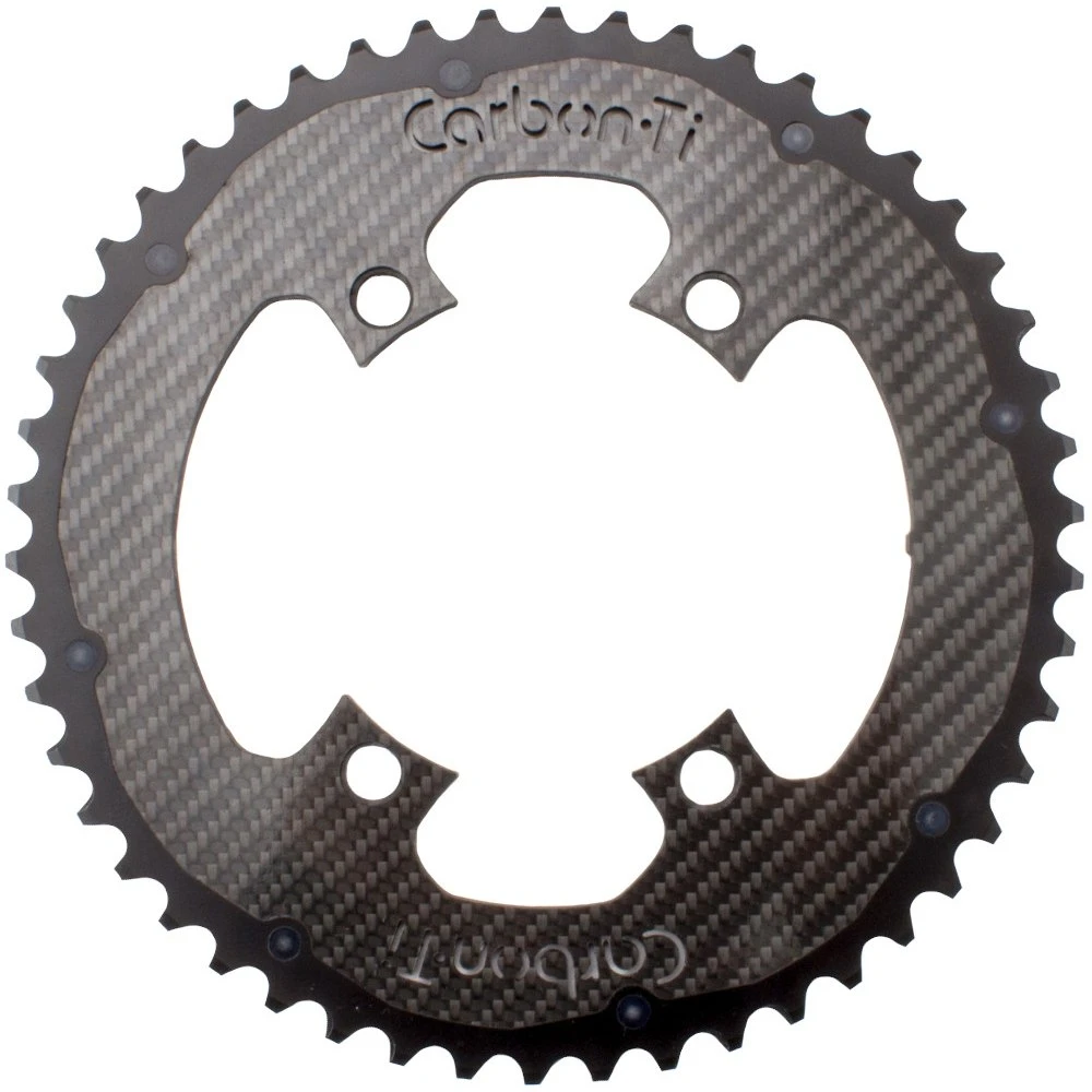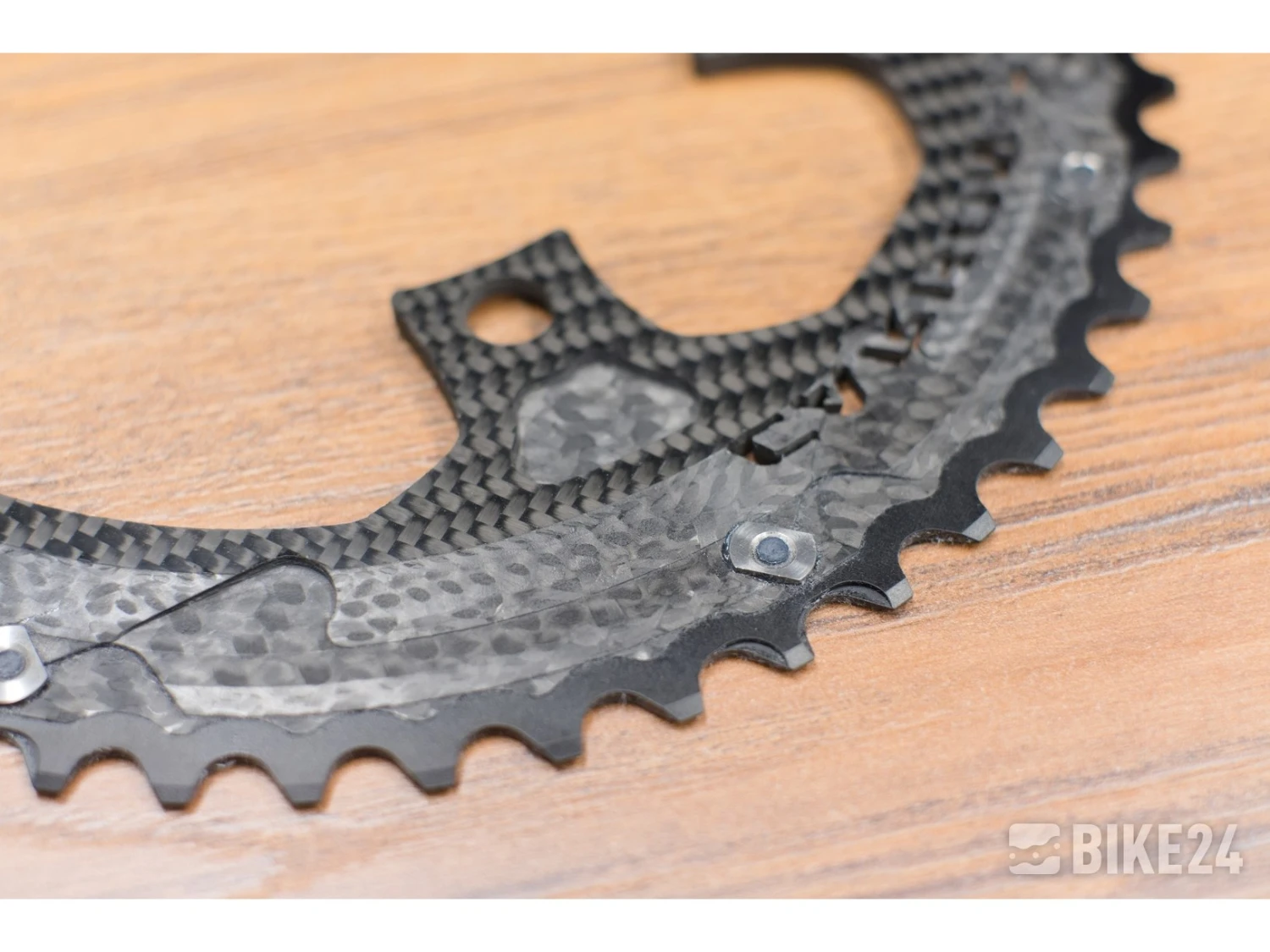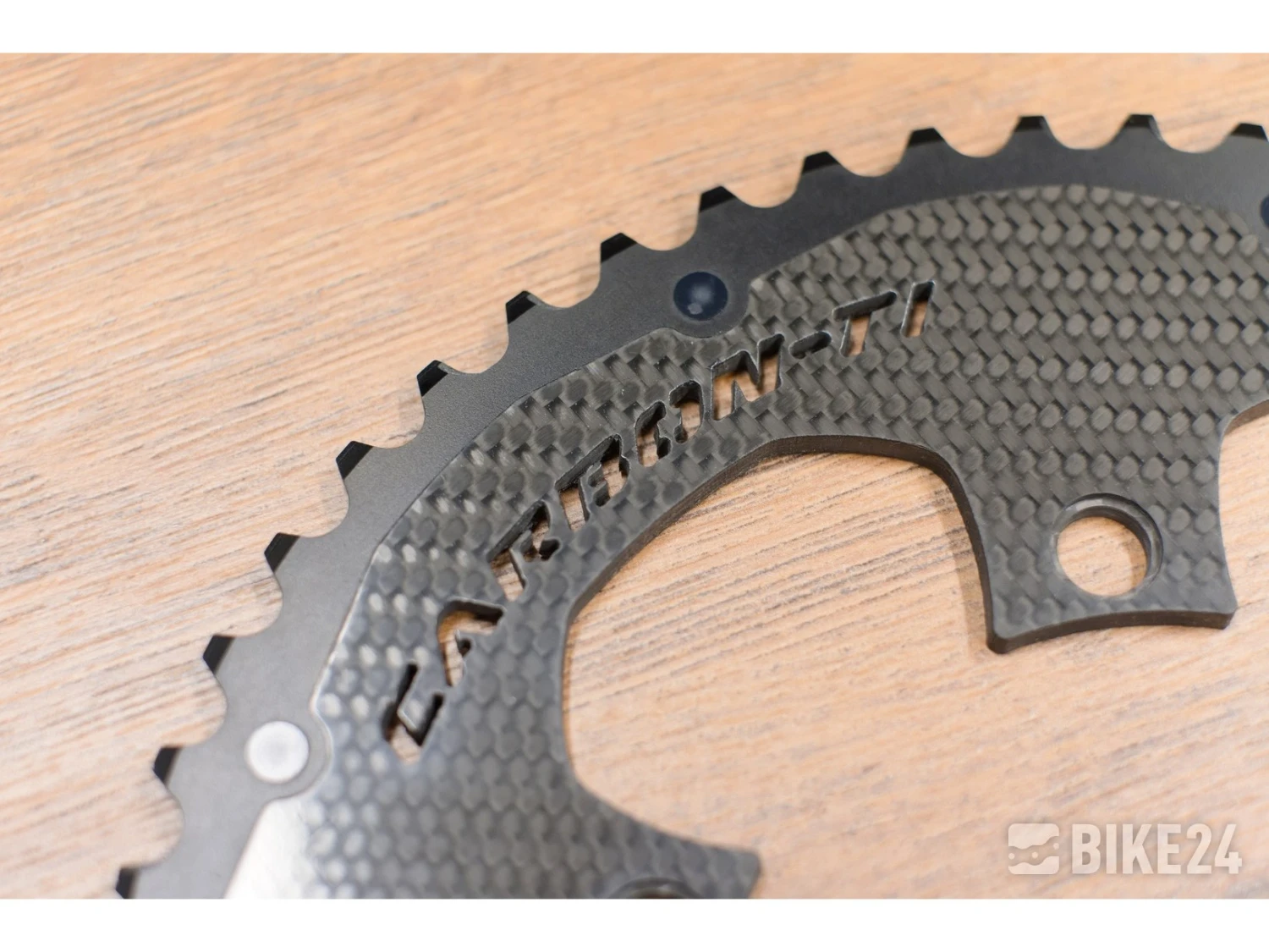 X-CarboRing is de volgende generatie superlichte carbon en aluminium kettingbladen van Carbon-Ti. De hoofdbehuizing is gemaakt van structureel koolstofvezel met titanium en CNC-bewerkte klimhulpmiddelen, en biedt verbazingwekkende schakelprestaties met mechanische of elektronische voorderailleurs. De tanden zijn gemaakt van 7075-T6 aluminium, individueel bewerkt en geoptimaliseerd om onder alle omstandigheden goed te functioneren.