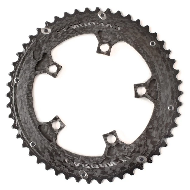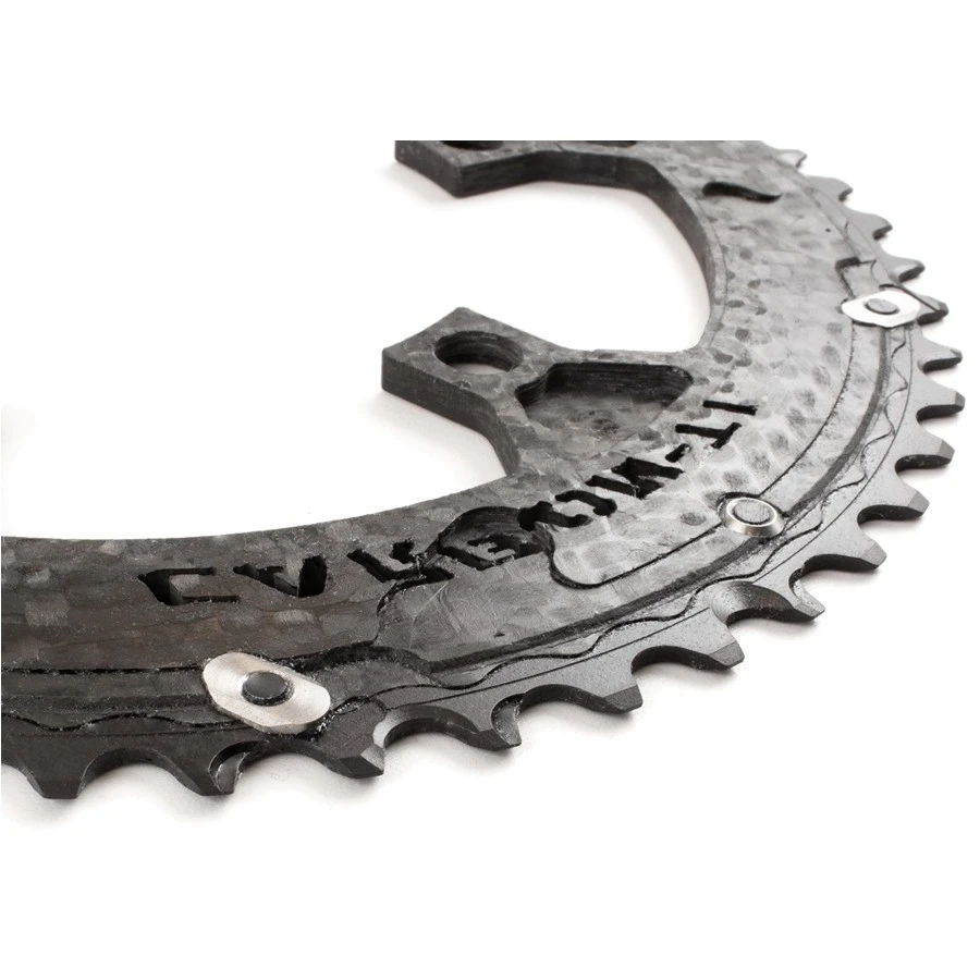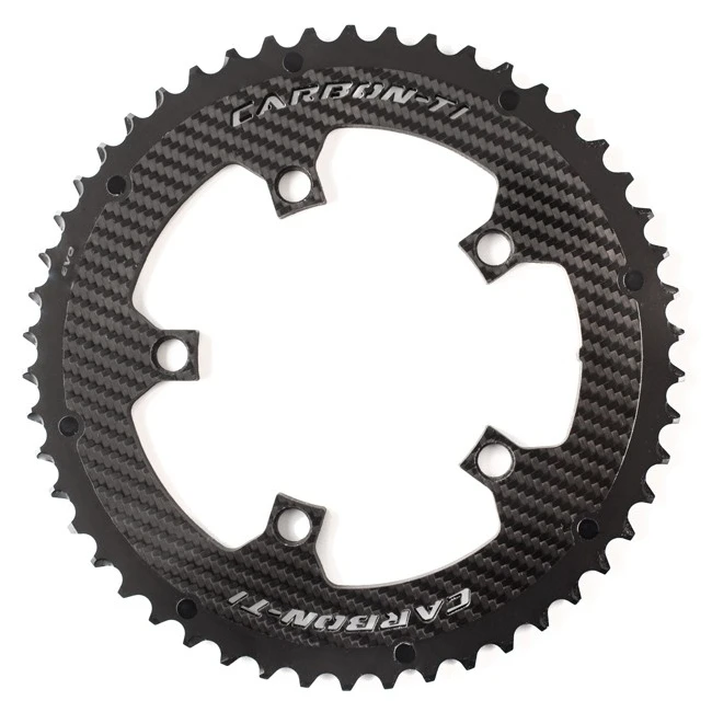 Het Carbon-Ti X-CarboRing EVO kettingblad is de nieuwste ontwikkeling van superlichte kettingbladen voor racefietsen met een composietstructuur van aluminiumlegering en koolstofvezel. De aanduiding “EVO” identificeert deze nieuwe generatie externe kettingbladen, die de bekende innovaties van de X-AXS kettingbladen overneemt, die speciaal ontwikkeld zijn voor SRAM AXS 12s groepen.
