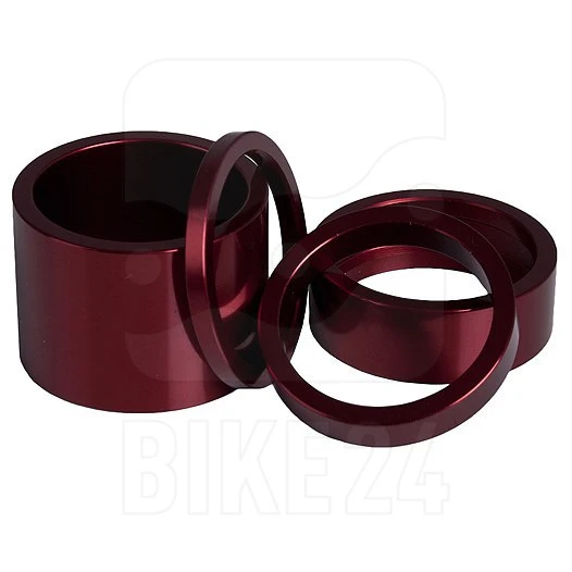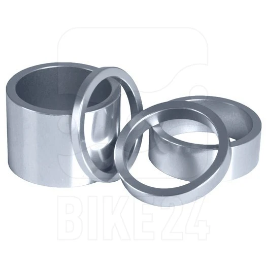 De belangrijke verbinding tussen het stuurcentrum en het wiel. Zij dienen niet alleen om de hoogte van de stuurpen te regelen, maar zijn ook verantwoordelijk voor de juiste uitlijning van deze verbinding. Daarom verdienen zij dezelfde aandacht als alle andere onderdelen. Door ze in een complex draaiproces uit hoogwaardig aluminium te vervaardigen, wordt een exacte afmeting, concentriciteit en parallel contactoppervlak van de afstandhouders bereikt. Deze vierdelige kit (1 1/8 inch diameter) bestaat elk uit een spacer van 3, 6, 12 en 25 mm hoog.