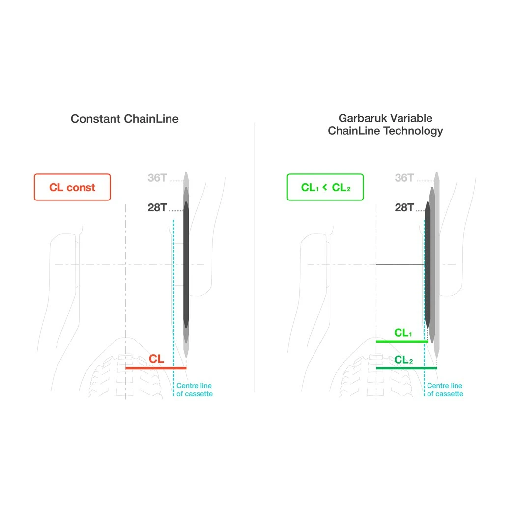 Het bijzondere van smalle/brede kettingbladen is de wisselende breedte van de afzonderlijke tanden, dikke en dunne tanden wisselen elkaar af en verminderen het risico dat de ketting eraf springt. Garbaruk kettingbladen hebben ook een grotere tandhoogte, waardoor de ketting beter blijft liggen op zeer hobbelige ritten. In vergelijking met conventionele kettingbladen garandeert de speciale tandvorm een beter contact met de ketting en een aangenamer trapgevoel.