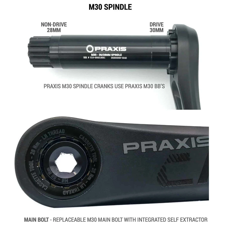 Dankzij de bijpassende M30 bottom brackets van Praxis Works kan de crank in bijna elk frame gebruikt worden: BSA, BB90/92, BB30, PF30 en zelfs T47 bottom brackets zijn beschikbaar.