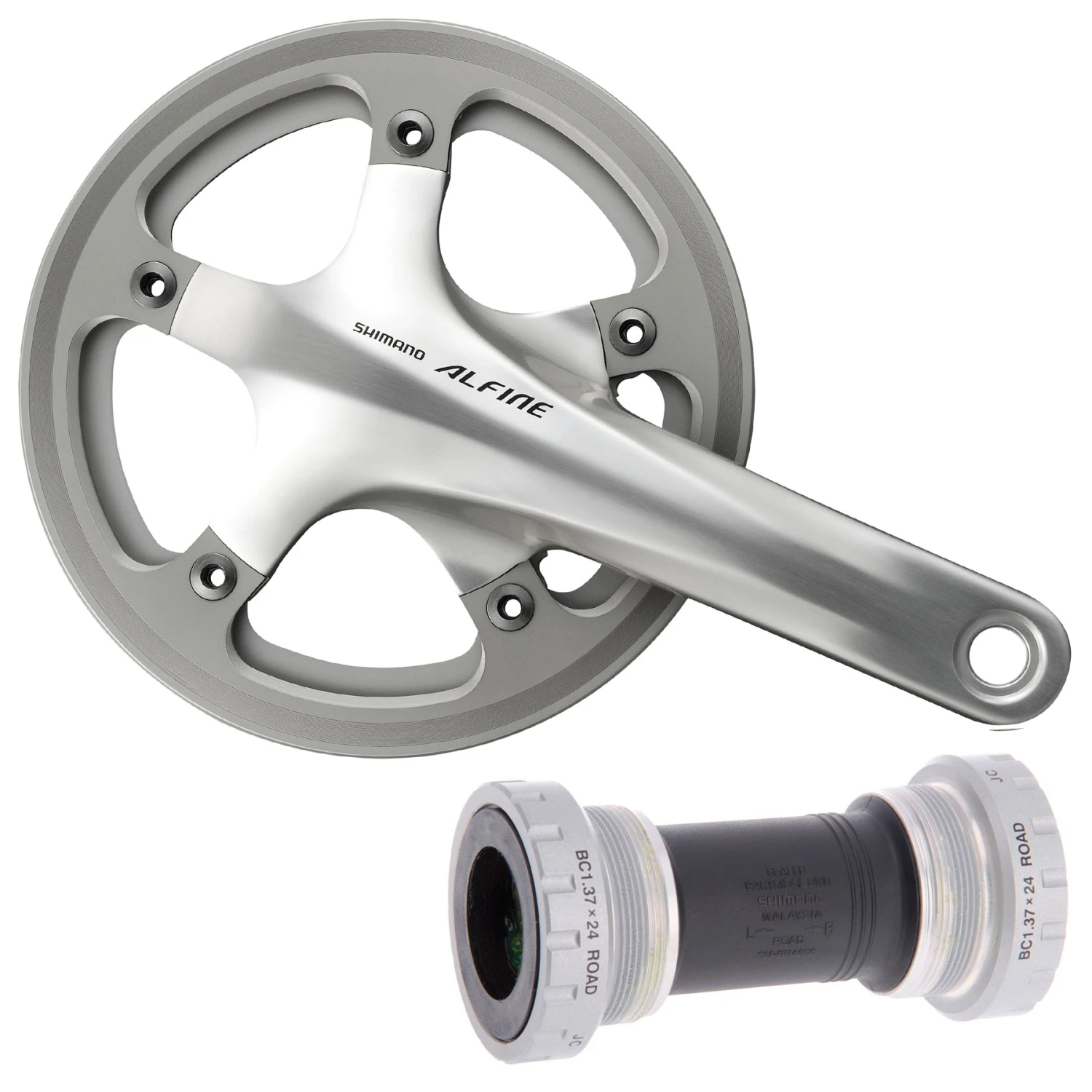 De tweedelige Shimano Alfine FC-S501 crank heeft aluminium crankarmen en een kettingblad en een geïntegreerde lageras. De crank is compatibel met zowel de Alfine 8-speed en 11-speed naafversnellingssystemen. Versie met kettingkastring aan de buitenkant.
