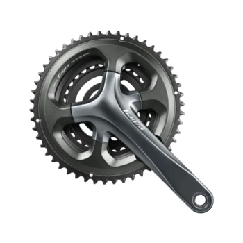 Triple crank voor 10-speed aandrijvingen van de Shimano Tiagra 4700 groep met geïntegreerde lageras. In het onmiskenbare Shimano-design zonder crankkap met glanzend grijze afwerking en geanodiseerde kettingbladen. Tweedelige combinatie van cranks en trapas.