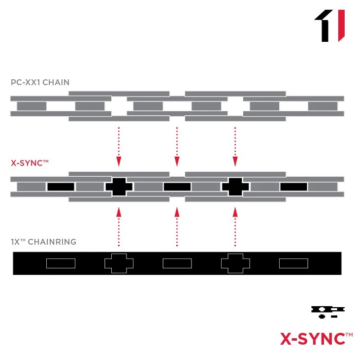 SRAM’s X-SYNC™ 1X kettingbladen bieden de hoogste prestaties en duurzaamheid. De lange SRAM X-SYNC™ tandranden grijpen eerder in de ketting dan traditionele driehoekige tanden. Het scherpe en smalle tandprofiel en de afgeronde schuine kanten ondersteunen de kettinggeleider. Om zelfs op modderig terrein de best mogelijke prestaties te bieden, zijn de X-SYNC™-kettingbladen voorzien van inkepingen om vuil en modder te verwijderen voor de binnenste kettingschakels en rollers. De in Duitsland ontwikkelde X-SYNC™ kettingbladen zijn een belangrijk onderdeel van SRAM’s 1X™ aandrijving.