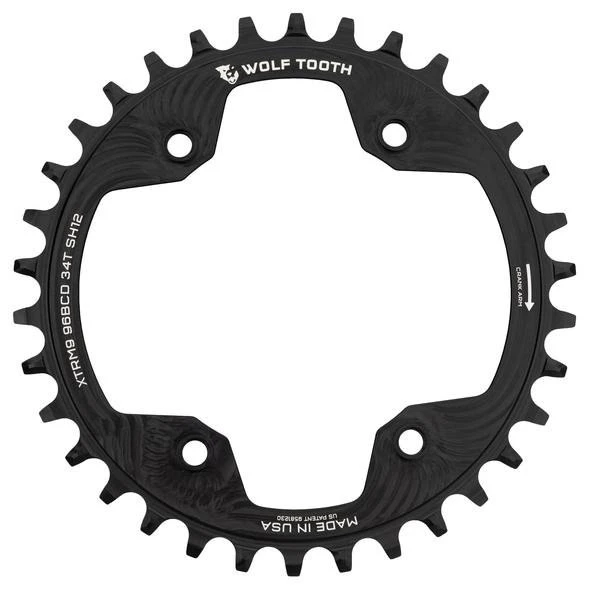 Het Wolf Tooth 96 BCD kettingblad voor XTR M9000/M9020 cranks schittert niet alleen door zijn esthetische, superlichte verwerking: dankzij het gepatenteerde Narrow-Wide-Design wordt de ideale 1-speed afstelling bereikt en wordt voorkomen dat de ketting van het kettingblad valt.