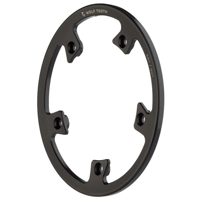 Met de Wolftooth Bashguard Ring kunnen alle cranks met Wolftooth Direct Mount kettingbladen van roestvrij staal ook worden uitgerust met een bijpassende bashguard. Beschikbaar voor 24-26 en 28-30 tanden.